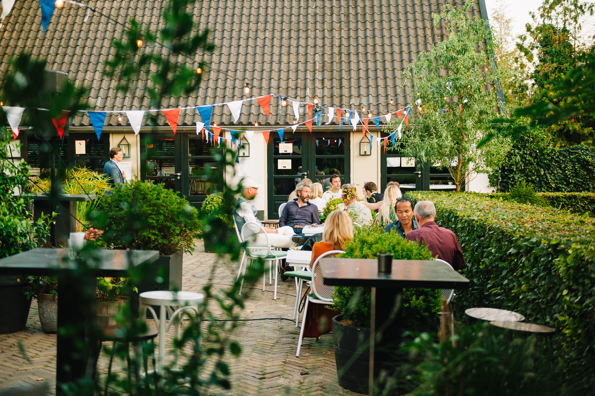 Adjacent to the Garden Room is the well-maintained back garden with a large terrace. Characteristic centuries-old trees and pavers, beautiful hedges and attractive outdoor bars complete this festival location.